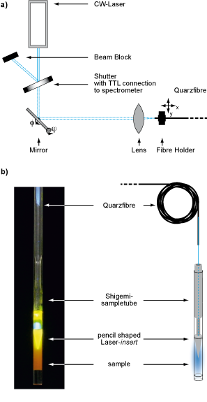 Figure: Laser Setup for in-situ illumination of NMR-samples a) laser setup outside the magnet, b) modified NMR sample tube